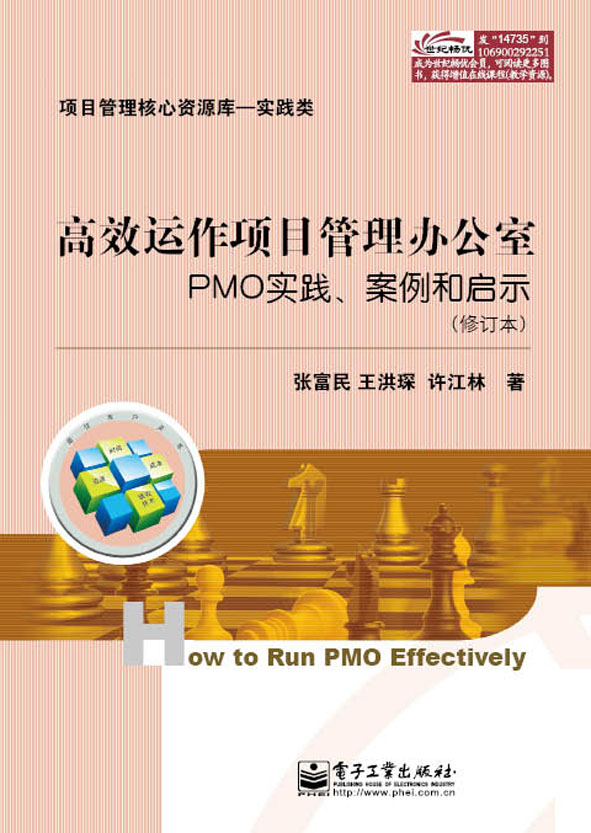 三位具有丰富项目管理实践与咨询经验的资深项目经理,通过形象直观的图表解析、清晰严谨的运作流程、简易实用的操作模板、丰富生动的管理实例,帮助提升和激发读者以下方面的能力:评估组织建立项目管理办公室(PMO)的必要性及建立的条件是否成熟;向管理层推荐PMO的理念和价值,制定合适的PMO建设计划;带领或直接参与PMO建设项目团队,并在其中担当重要角色;协助或参与PMO的有效运作,成为PMO成员,或为PMO提供支持; 评价组织PMO的运作绩效,对PMO职能的持续改进提供建议。